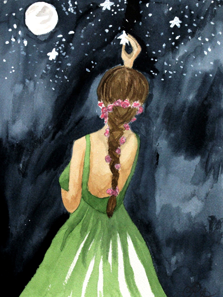 Claire woke up with the moon shining on her face. After a night of dancing, she was still dressed in her green gown. Led by the moon, she walked outside barefoot to get a better view of the night sky. Dew was just starting to form on the grass and it caused her feet to make a slight squishing sound. She walked to an open field and started to survey the stars. Claire realized that something did not seem quite right. She closed her eyes and floated toward the stars, letting her intuition guide her to the exact star that needed changing. She realized that this star had been causing the recent bout of clumsiness she had been experiencing in her life. Claire moved it just to the right of the moon so it could benefit from its light and steadiness. Once she finished rearranging the star, she returned to the ground. Claire walked back home and settled into her bed by the window to examine her celestial handiwork. She smiled and fell into a deep sleep knowing that things would be better tomorrow.